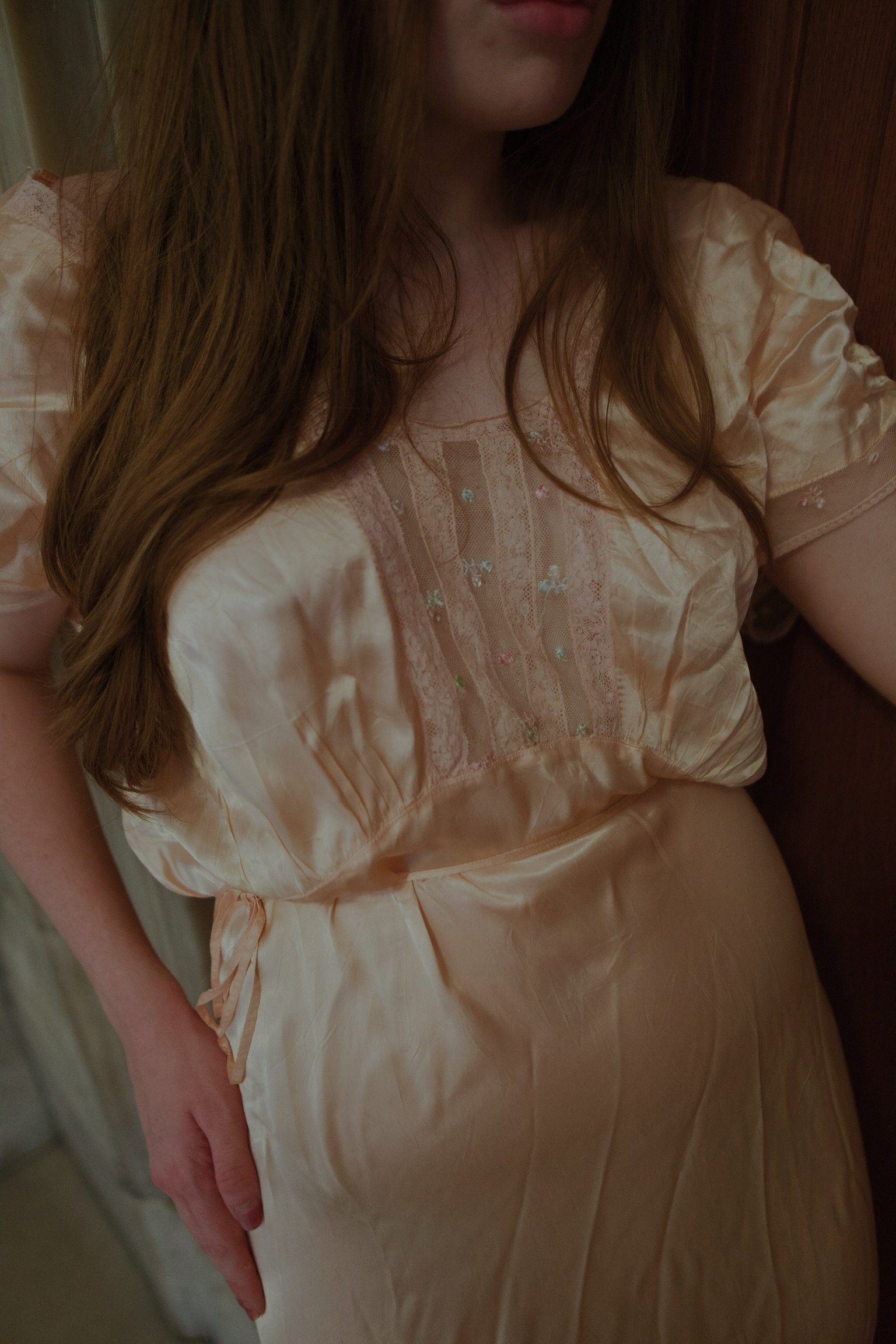 Era & Style: A rare 1930s rayon satin slip in luminous peach, elevated with delicate lace and pastel floral embroidery at the bodice. Brand is "Countess Rayon Perfect Fit." Material/Fabric: Rayon satin with inset lace panels and embroidery. Design Highlights: Sheer lace bodice striped with floral embroidery, short flutter sleeves, and bias-cut skirt for fluid drape. Condition: Good vintage condition overall; a few slight marks of discoloration near shoulder, two pin holes in the lace at front of bodice, small wear mark on the skirt where fabric is not torn but has some wear to fabric, consistent with age. Fit Info: Bias cut with natural stretch; fits like a modern XL. Up to 45" bust, up to 40" waist, 57" shoulder-to-hem. Bias cut allows for a variety of sizing. A jewel of 1930s lingerie—silk, lace, and embroidery combined in a piece that feels as much like art as it does clothing. DM on Instagram for detailed condition images.