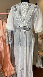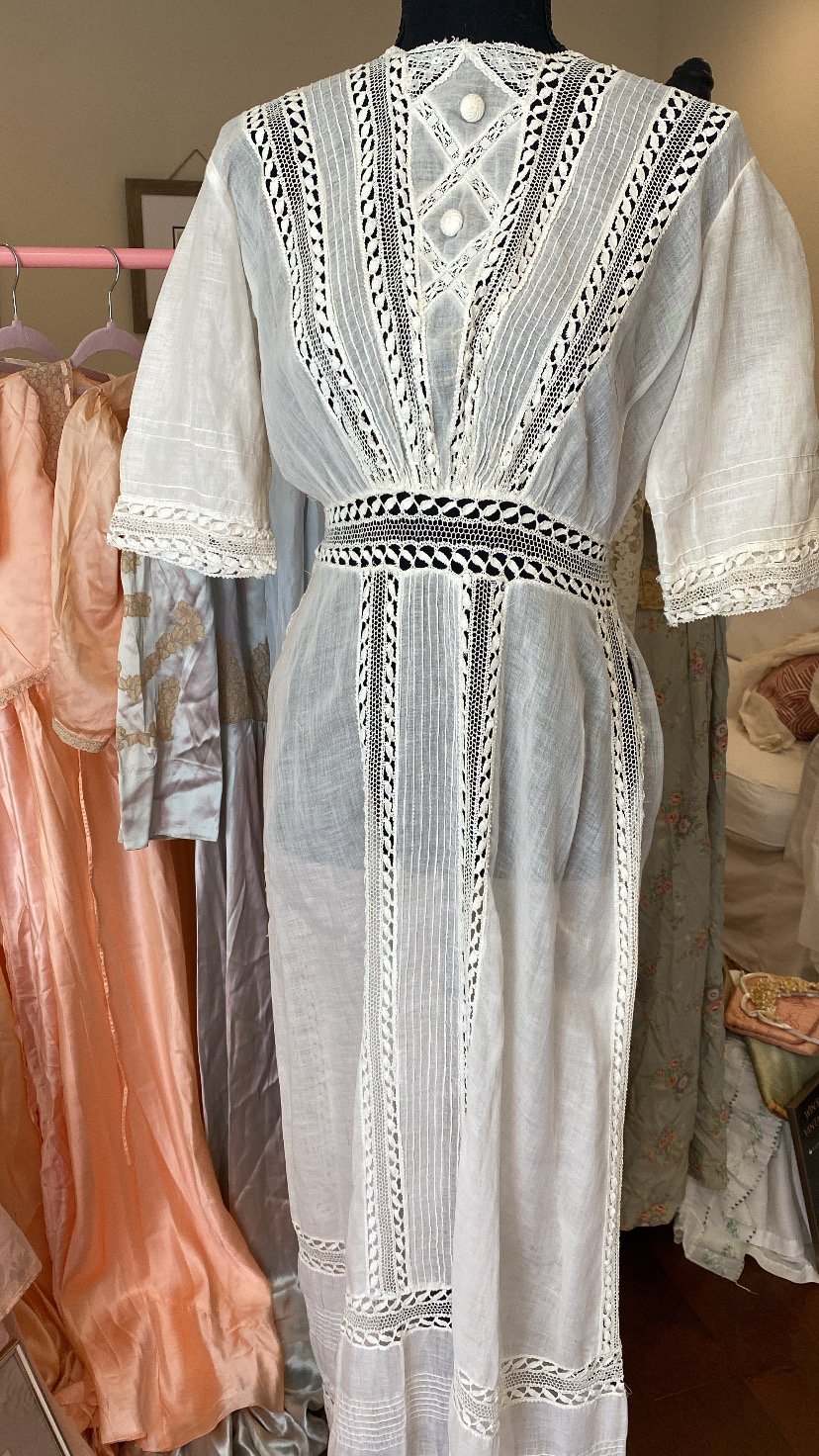 Era & Style: A luminous Edwardian gown, c. 1910s, with intricate lacework and pintuck detailing—an heirloom piece steeped in delicate craftsmanship. Material/Fabric: Lightweight cotton batiste with inset lace panels and embroidered accents. Design Highlights: High waist, flowing silhouette, shell buttons, and bands of lace framing the bodice and skirt. Condition: Very wearable; a few small rust marks here and there, consistent with age. Fit Info: Fits like a modern XS. 25" waist, 32-36' bust, 53.5' shoulder-to-hem. Why It’s Special: A romantic Edwardian relic that captures the artistry of its era—perfect for collectors, bridal styling, or ethereal everyday wear. DM on Instagram for detailed condition images.