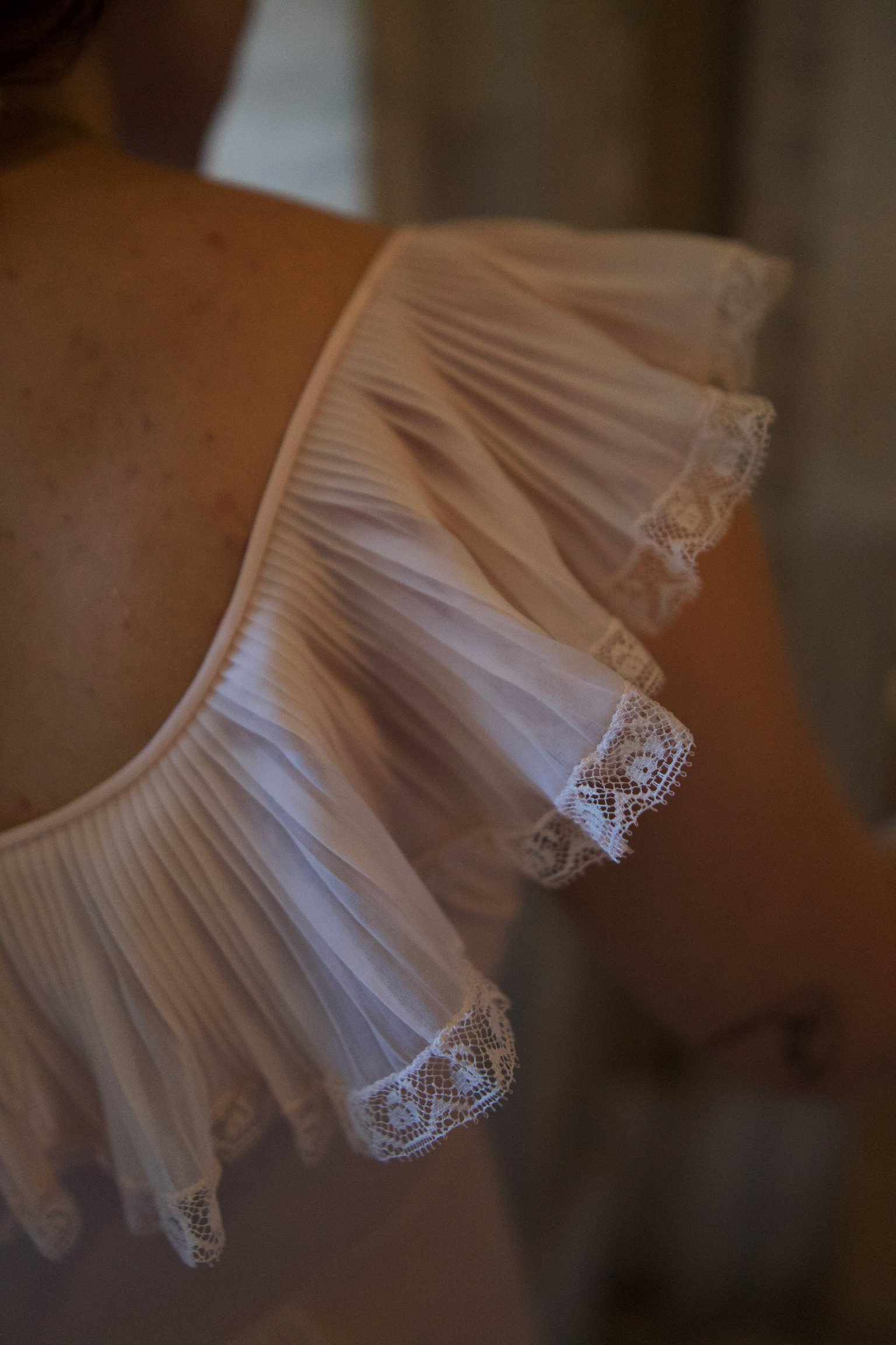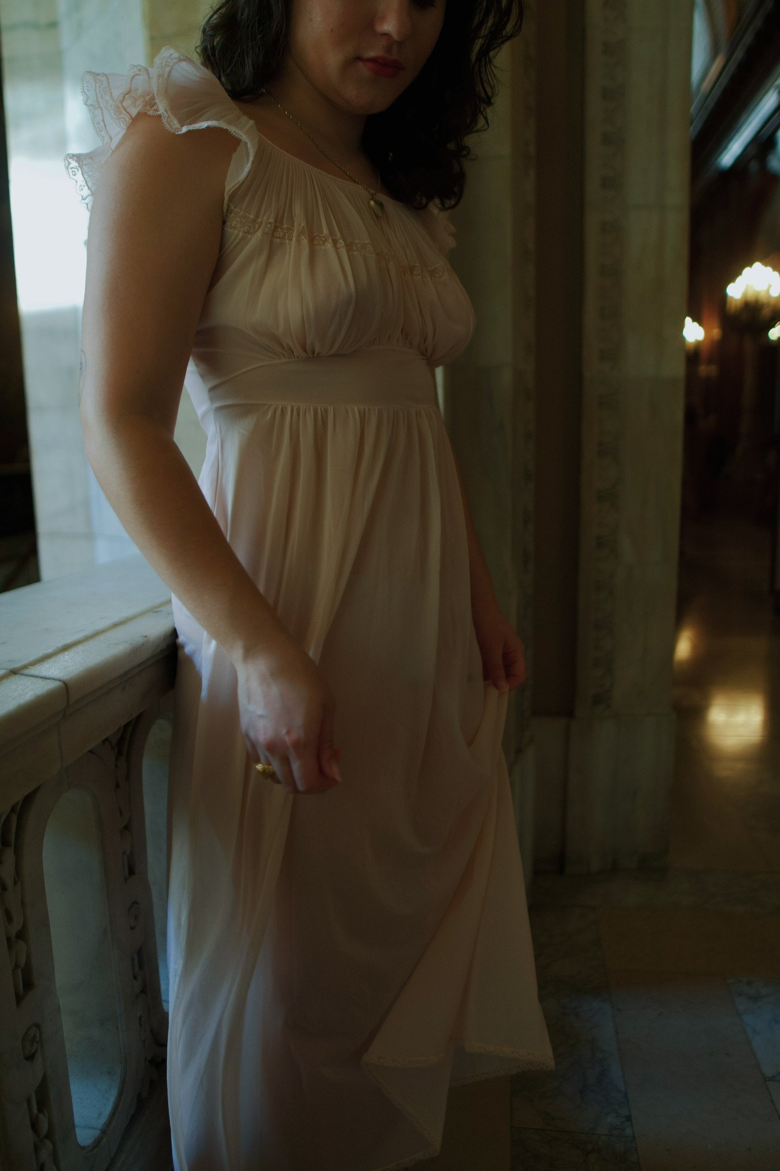 A quintessential 1950s boudoir piece. Feminine, airy, and luminous, with delicate lace detailing.